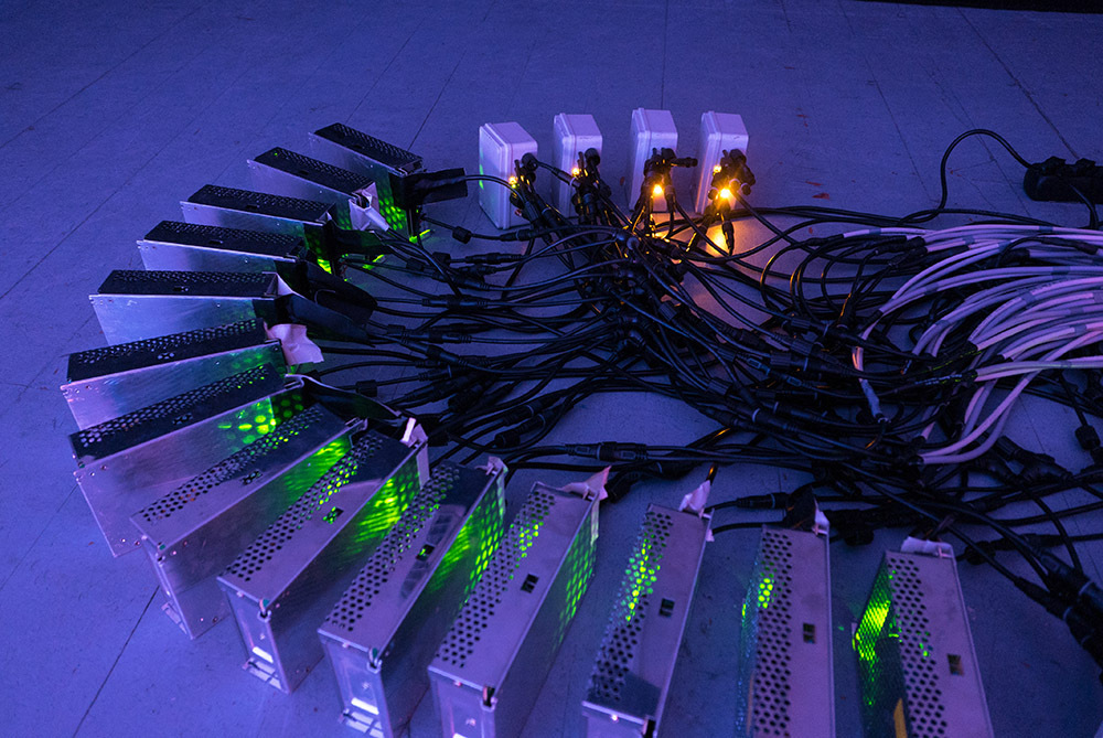 The installation has 9.600 randomly assembled pixels that are mapped in the three-dimensional space and are individually controllable. Because of the spatial representation of the pixels in virtual space, it is possible to form three- dimensional shapes, patterns and structures out of the chaotic cluster: an apparent intelligence that reveals itself within the seemingly random formation.