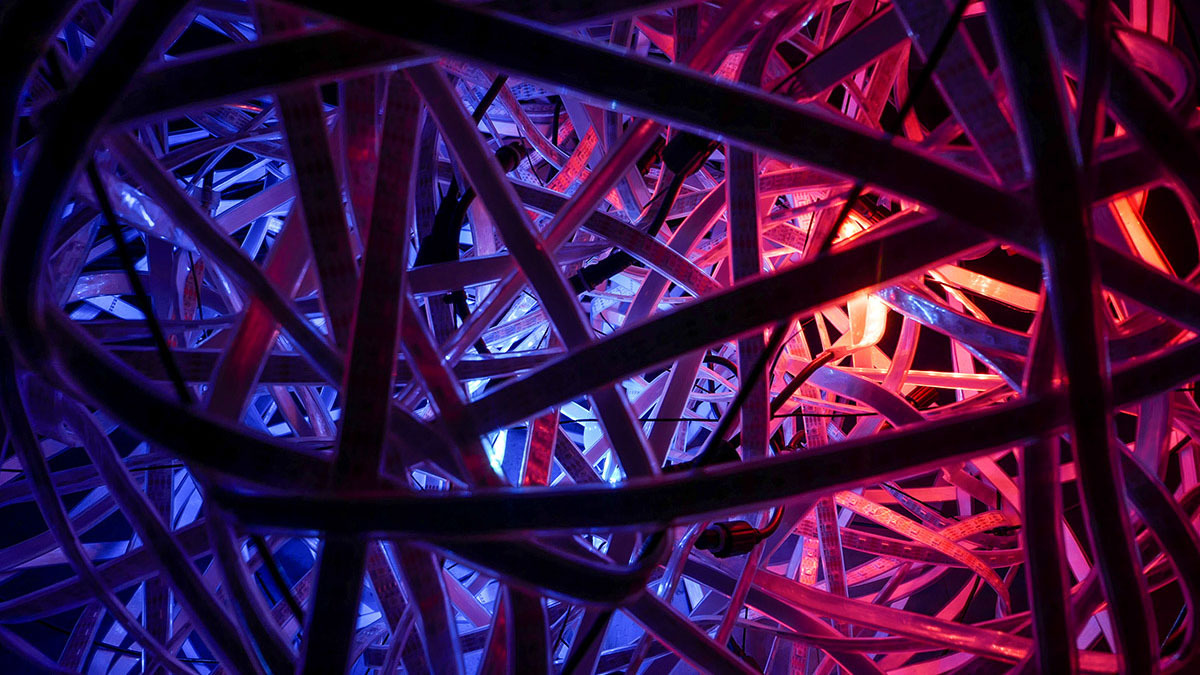The object consists of a seemingly chaotic cluster of thirteen thousand LEDs in which readable patterns of light appear. Each LED is connected to an output neuron of the neural network and represent its state by its brightness. The LEDs are mapped in three-dimensional space. Training data are generated from classifications of sounds to three-dimensional shapes, and the state of the neural network is represented as a readable pattern of light.